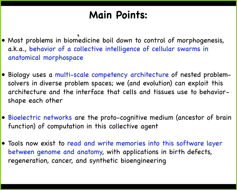 These are the main points I would like to transmit today. First, that most problems in biomedicine and also in synthetic bioengineering boil down to the control of morphogenesis. I'm going to frame this problem as the behavior of a collective intelligence of a cellular swarm in a particular problem space we call anatomical morphospace. I'm going to emphasize that biology uses a multi-scale competency architecture, which consists of hierarchical problem solvers in various problem spaces, and we, evolution, and various parasites can exploit this architecture and the interface that cells and tissues use to shape each other's behavior. In particular, bioelectrical networks are a large part of the medium through which this collective agent processes information. They're basically the ancestor of the nervous system and brain function. I'm going to tell you that tools now exist that we have created to read and write memories into this software layer that sits between the genome on the one hand and the anatomy and function on the other hand. There are many applications here in birth defects, regeneration, cancer, and synthetic bioengineering.