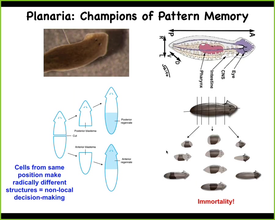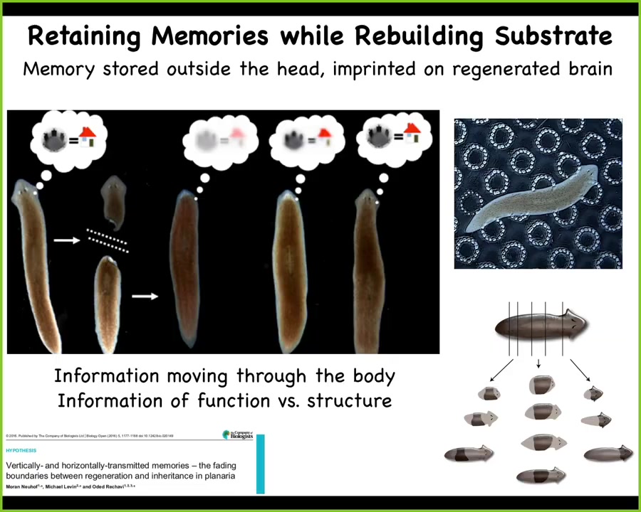 What McConnell learned in the 60s was that if you train this animal to recognize a specific stimulus and then cut off the head, the tail sits there doing nothing for about 8 to 10 days. Eventually it grows a brand new brain, and then you find out that this animal remembers the original training. What you have here is the ability to store behavioral memories somewhere outside the brain and then to imprint that information onto the new brain as it develops. This is the movement of information throughout the body and a tight integration of morphological information.