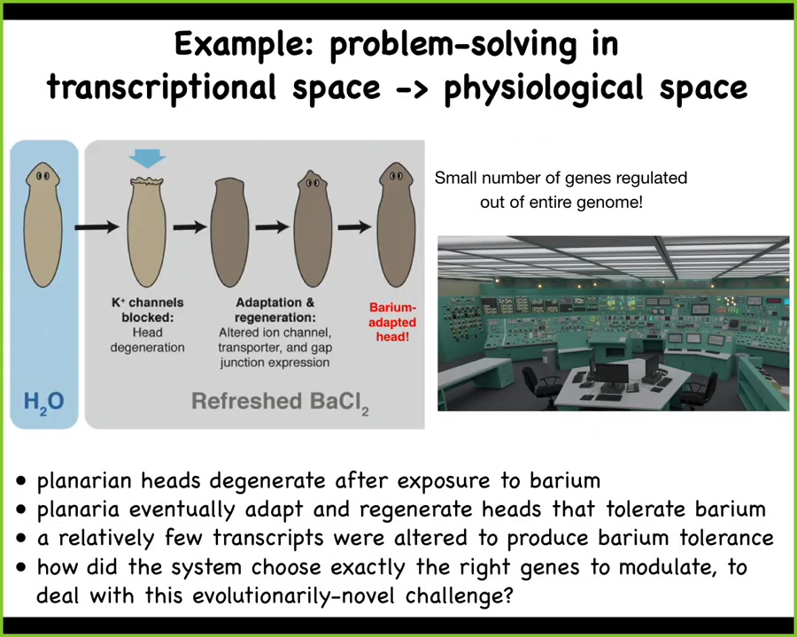 Here's the most amazing part: planaria never encounter barium in the wild. There is no evolutionary pressure to know what to do when you encounter barium. So what we're looking at here is an amazing ability to navigate the very large dimensional space of gene expression to find exactly the ones you need to solve your problem.