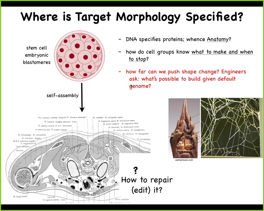 So you might ask, where is this pattern encoded? It's got to be somewhere. One is tempted to say DNA, but we can read genomes now. We know what's in the DNA. What's in the DNA is the descriptions of the micro-level hardware that every cell gets to have, the proteins. The genome doesn't say anything directly about what the layout here is, what kind of symmetry it has, whether it's regenerative, how many fingers. The DNA doesn't say anything like that any more than the DNA directly specifies the shape of termite colony nests or spider webs. These are all the results of a physiological software layer that sits between the genome and the anatomy.