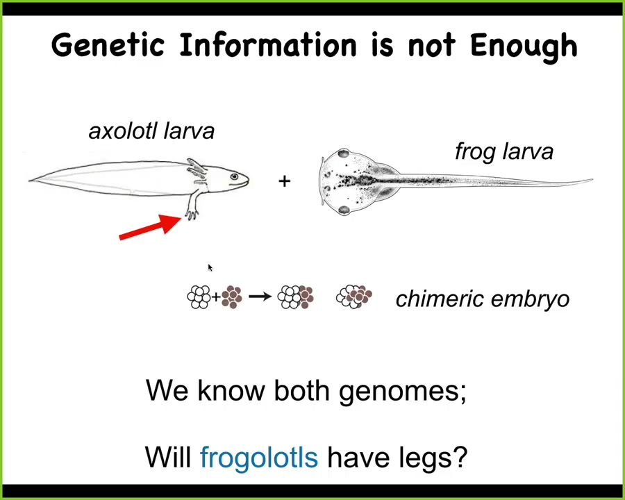 I ask a simple question. If I were to make this frogolotl, is it going to have legs? After all, you have the axolotl genome, you have the frog genome. Can you tell me if a frogolotl is going to have legs or not? And if it is going to have legs, can you tell me whether those legs will be made only of axolotl cells or whether the frog cells will somehow participate in this process? And by the way, what will the shape of those legs be? Will they be like axolotl legs or like frog legs? We have no ability to derive any of these things from genomic information.