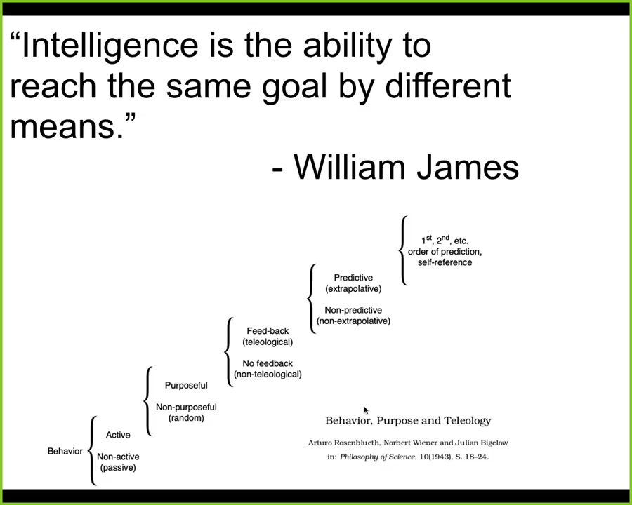 Now I'm going to use some terms from time to time, things like intelligence and problem-solving. What I mean is not some mystical, magical feature that only humans have. What I mean is a definition like one used by William James, who said that "intelligence is simply the degree of ability to reach the same goal by different means."