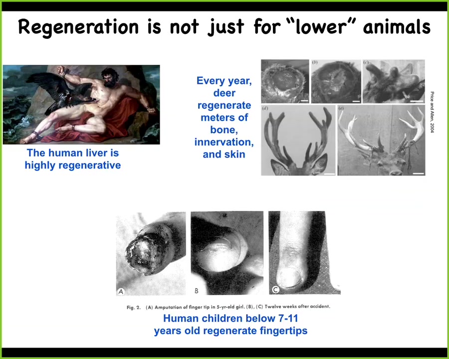 Regeneration isn't just for worms and amphibians. Humans have a highly regenerative liver. Even the ancient Greeks seem to have known that. The deer every year regenerate huge amounts of bone and vasculature and innervation. These antlers grow at a rate of a centimeter and a half per day of new bone. Remarkable regeneration of an adult mammal. And human children are known to regenerate their fingertips up until a certain age. If they have a clean amputation and you don't close it up, you'll get, cosmetically, a very nice finger regeneration after that.