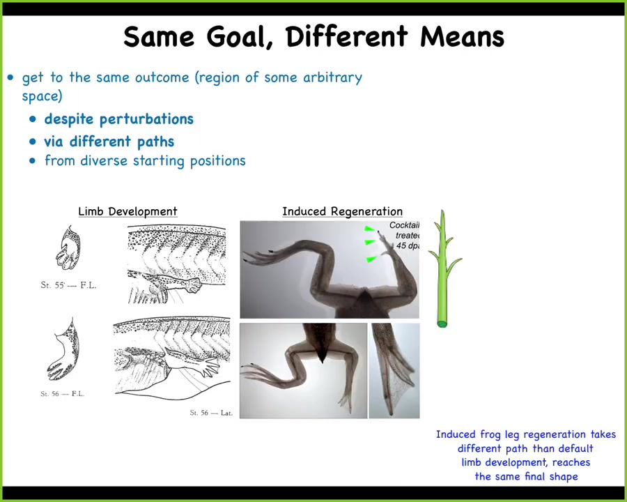 Here is another example of that in an adult organism. This is an axolotl. These guys regenerate their limbs, their eyes, their jaws, their spinal cords, their ovaries, and so on. If you amputate anywhere along this limb, the cells will start to rebuild. They will build exactly what's necessary, no more, no less, and then they stop. When do they stop? They stop when a correct salamander arm has been completed. That starts to suggest the process of anatomical homeostasis, meaning that this walk in the space of possible morphologies that it does, the system not only ends up where it needs to go, but then it actually can stop and stabilize where it needs to go.