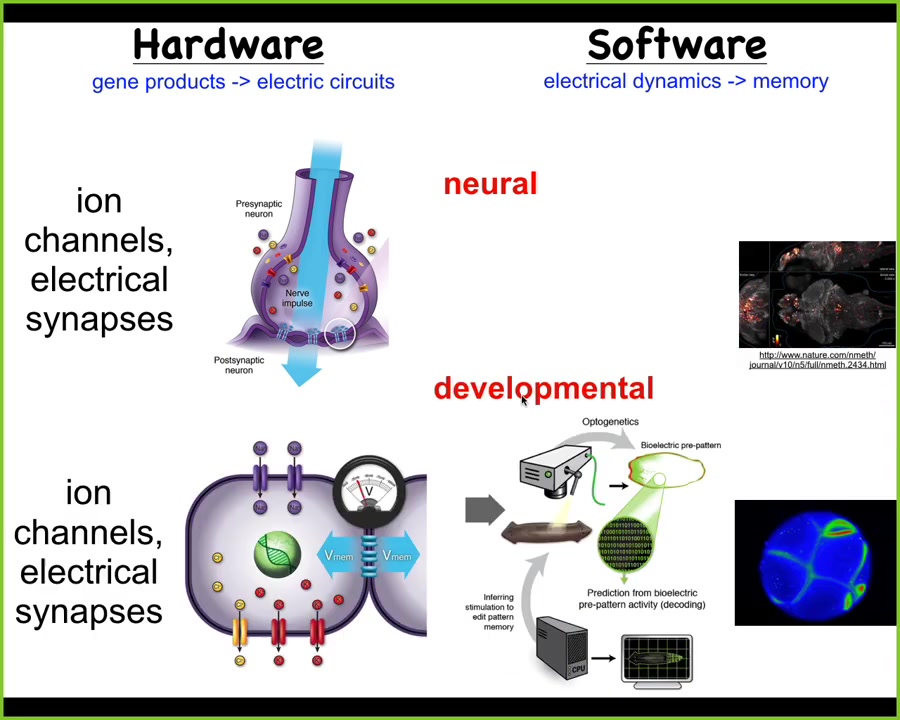 It turns out that every cell has this. Every cell has ion channels. Most cells have gap junctions, these electrical synapses with their neighbors. This system is way older than neurons and brains. This was actually invented around the time of bacterial biofilms. Evolution discovered this. Could we port from neuroscience all of the tools and concepts to do the neural decoding that people do in the brain and do it during morphogenesis to ask, what is the collective intelligence? What people are doing is asking, how does this electrophysiology help us understand what the collective intelligence of these cells is doing? How is the electrophysiology of morphogenesis helping us to understand how that collective behaves in morphospace?