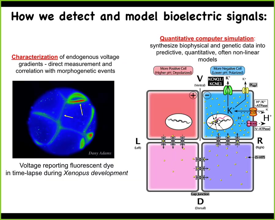 We developed some tools to try to read and write this information into the collective computations of cells. First, voltage-sensitive dyes. This is a voltage-sensitive reporter dye that helps you image what all the electrical states are in this early frog embryo. This is a time-lapse here. Then we do biophysical modeling to understand how these gradients arise from different channels and pumps that all of these cells have.