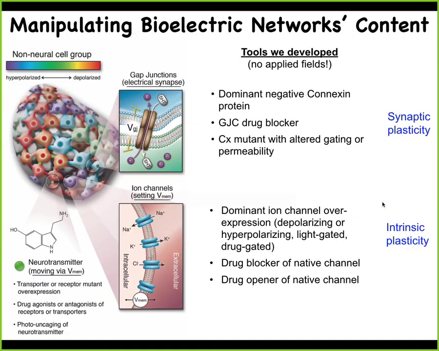 Now, the more important thing is the functional tools. What we do is we steal everything from neuroscience. We don't use any applied electromagnetic fields. We don't use electrodes. What we do is we target using molecular tools such as pharmacology and optogenetics. We use molecular tools to target the natural interface that these cells offer to us and to each other. That interface is the gap junctions that determine the connectivity of the network and the ion channels that determine their electric state at any moment in time. So we can open and close these things with drugs. We can use light in the case of light-gated ion channels. We can use neurotransmitter signaling directly. All of the same tools that work in neuroscience work in every other tissue of the body.