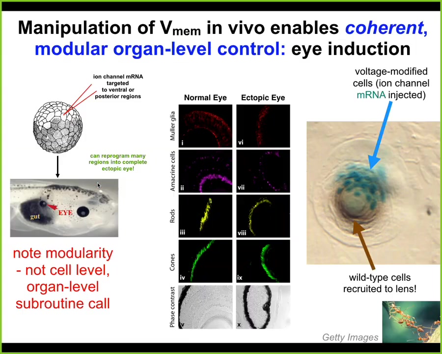 Notice a couple of critical things. First of all, these eyes have the same sort of internal components that normal eyes are supposed to have: lens, retina, optic nerve. But we didn't give them enough information to specify any of that complexity. All we did was specify a very informationally poor stimulus that didn't include all the details. This means it's a modular, almost subroutine call. It's a trigger. The cleverness isn't in what we put in. That's just a simple trigger. All the intelligence is in the rest of the tissue, which can see that simple signal and interpret that at the scale of organs. We're not telling individual cells that this stem cell should become a retinal cell. The information is an organ-level modular trigger.