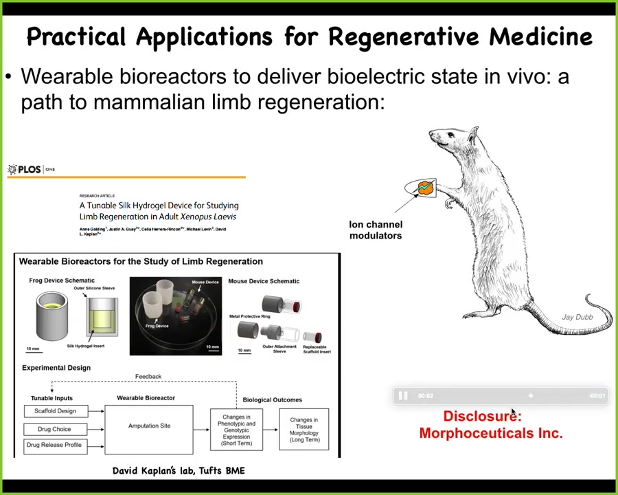 At this point, I have to do a disclosure. Dave Kaplan and I are co-founders of a company called Morphoceuticals, Inc., because we're now taking the same thing into mammals. The idea is using David's bioreactor, wearable bioreactor technology to stimulate the wound and try to get back some regeneration after injury. Remember, we are not micromanaging this process. We're not putting in stem cells. We are not directing differentiation over that time period. 24 hours of stimulation gives a year and a half of leg growth in the frog. It is not controlling that process. It is convincing those cells right at the beginning, when they're trying to make a decision between scarring and growth, which way they're going to go. After that, we take our hands off. That's a key strategy from the perspective of engineering that you want to exploit the autonomous capacities of your material. You do not want to try to have to micromanage it.