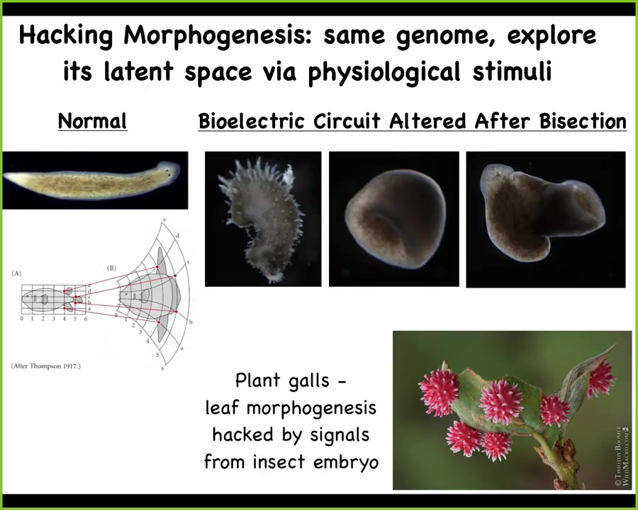 Not only can you explore those attractors, there's a huge latent space of possible shapes that you can make. These are all wild-type planarian cells. This is a crazy spiky haired, spiky shape form. You can change the symmetry type, you can make composite forms like this. This is not some weird feature of planaria. This is ubiquitous.
