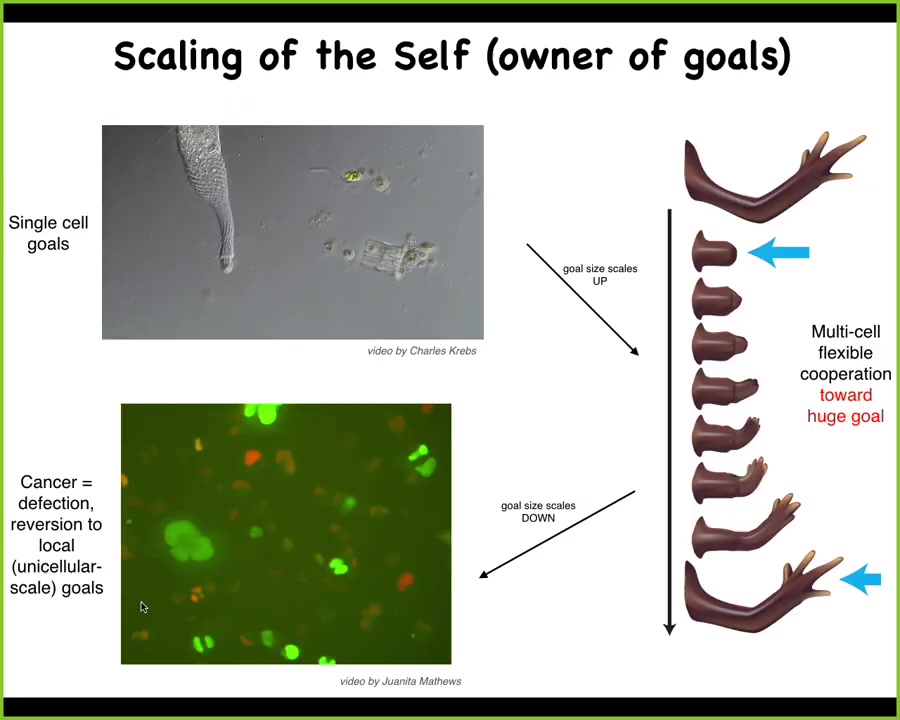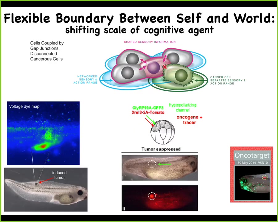 If you have this unusual view of cancer as a problem of a shrinking computational boundary between self and world, the idea is that when cells connect to each other, they have a bigger perceptual, cognitive light cone that allows them to hold on to bigger goals, bigger homeostatic set points.