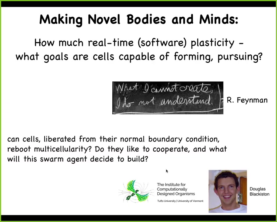 I'm going to argue that biology is reprogrammable in exactly the same way that universal kinds of computing devices are reprogrammable. In particular, what we're missing and what we are trying to work on is being able to exploit higher level information processing, what we call agency memory, decision-making, problem-solving, goal-directed activity.
