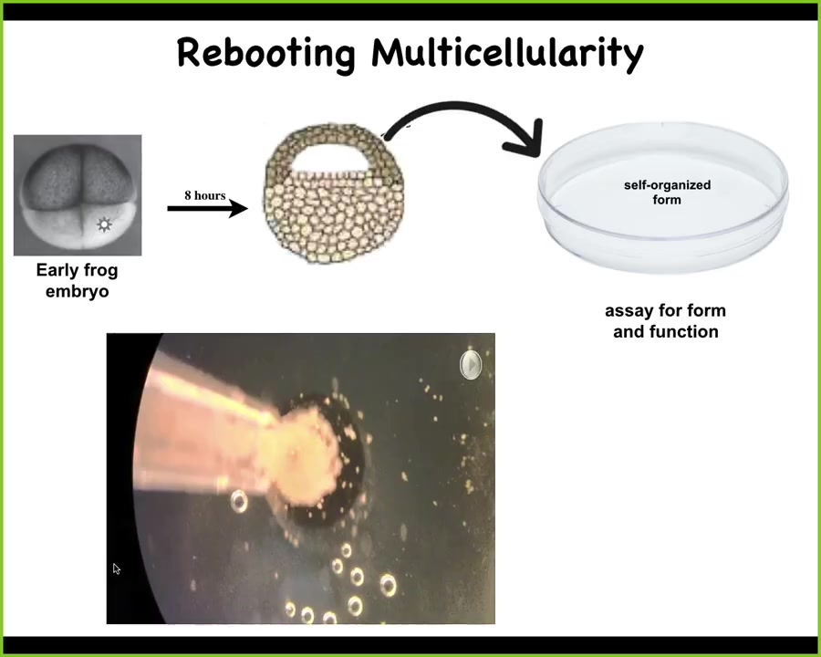 This never existed before. There's never been evolutionary pressure to be a good xenobot, to do kinematic replication. All of this is completely emergent in the latent space of behaviors from the machine that this genome encodes. I would argue that in some cases, evolution is not creating specific solutions to specific problems. It makes general-purpose problem-solving machines that are able to navigate different kinds of spaces in new ways. And as engineers, this is what we need to learn to manipulate.