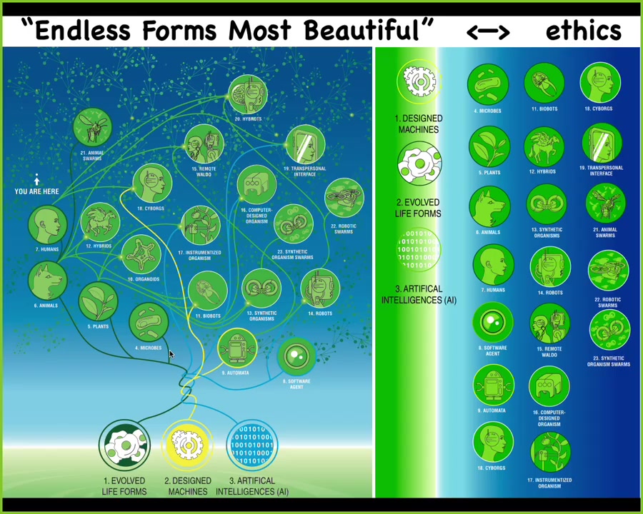 I think because of this, biology is incredibly interoperable. So every combination of evolved material, meaning genetic sequences, cells, tissues, organs, whatever, and some kind of designed matter and some kind of software, every combination is going to be some kind of viable creature on this enormous option space. So all of Darwin's "endless forms most beautiful"—the natural forms on earth are here. And all of these hybrids, cyborgs, every kind of combination of these things is here somewhere and that has huge implications for trying to develop not only a science but an ethics of relating to organisms that do not share any path on the evolutionary tree with us and have potentially radically different embodiments and thus minds.