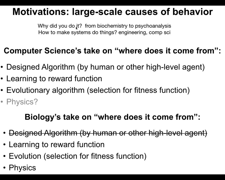 Then we have to ask the question, if you have a system which attempts to fulfill specific goals, where do those goals come from? Now we start talking about motivations. I'm going to start us thinking about where goals come from that goes beyond selection. In biology, this means in the genetics and the specificity of the environment. But what else is there? Where do motivations come from? This will help us connect it to engineering and computer science.