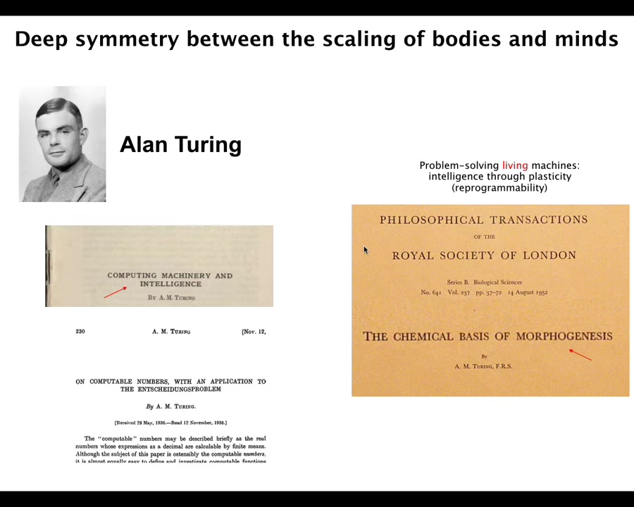 Alan Turing was already on top of this because here's someone who is very interested in intelligence, in reprogrammability, in body and cognition in other substrates. At the same time, he wrote this amazing paper on the chemical basis of morphogenesis. He wanted to know how chemicals in the embryo self-organize. Why would somebody interested in computing and intelligence be looking at chemicals in morphogenesis? I think it's because he recognized these are fundamentally the same problem. I think this is a very deep point. I'm going to show you a few examples.