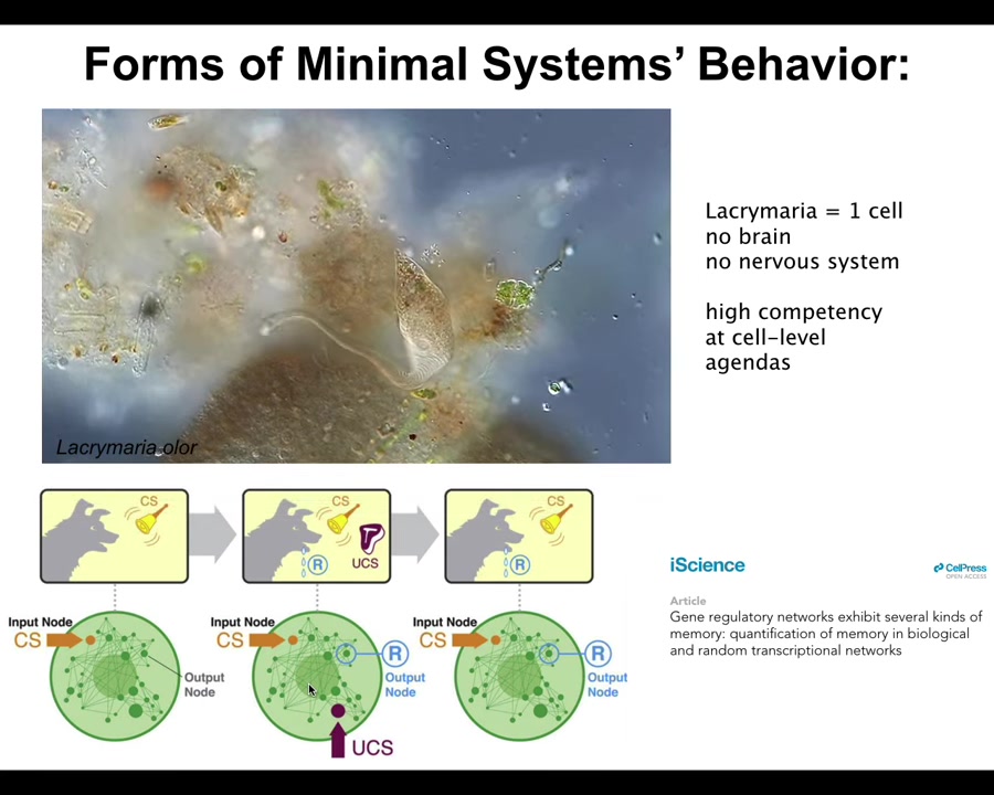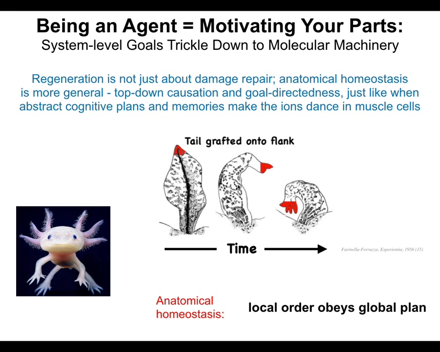 This is of course the hallmark of a cognitive system. You do this too in the morning when you wake up and you have very abstract educational goals and financial goals and social goals and whatever, in order for you to get up out of bed and do those things. The chemistry of your muscle cells has to change. The potassium ions have to cross the muscle cell membranes in order for you to do voluntary motion. So your whole body is this transduction apparatus that takes very high-level abstract goals and transduces it into the aligned actions of your parts, very, very small molecular parts. We're now seeing that these forms that we are talking about, the shapes of behavior of cell groups, are a target for goal-directed behavior.