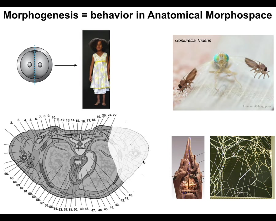 In particular, one behavior that we study in our group is morphogenesis, the navigation of systems through anatomical space, meaning the space of possibilities. You can think about the movement of the configuration of the body from a single cell towards the shape of a human or a snake or a giraffe or a tree as a navigation of this anatomical space. All of these, morphogenesis, the generation of the body shape, becomes just the behavior, albeit in a different space at a slightly different time scale.