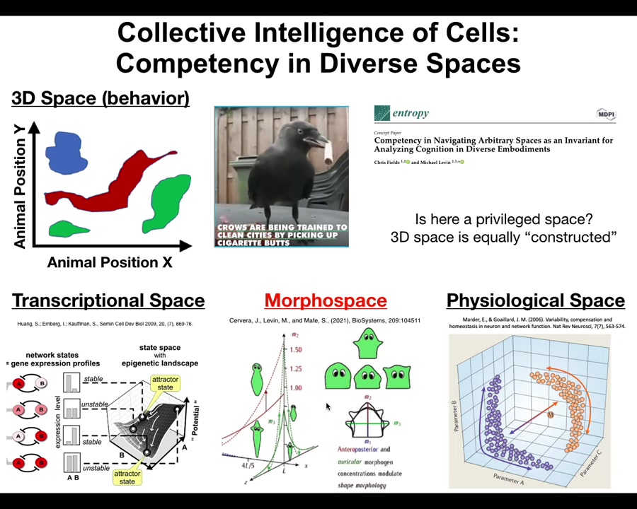 So I think what happens is that evolution pivots the same tricks through different problem spaces. Very simple early forms of life were navigating metabolic state spaces and then physiological state spaces, and then the genes came along and the space of transcriptional states. Then multicellularity came along and we could navigate anatomical morphospace. Then nerves and muscles came along and we were able to navigate three-dimensional spaces and now linguistic spaces and financial spaces and who knows what else.