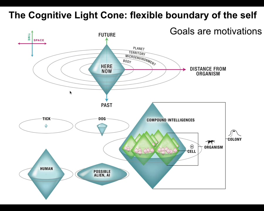 In fact, that's one way to define intelligence: how good are you at meeting the same goal by different means when the situation changes. In particular, I've defined this concept called a cognitive light cone, which is simply the idea that we can estimate the size of the biggest goal that a system can try to implement. So the size in space and time of the biggest pattern that the system is capable of storing as a set point for its behavior and trying to achieve that behavior. You can see different kinds of creatures can have different size cognitive light cones. This is not the range of your perception. This is not the range of your possible actions. This is the size of the goals that you're able to pursue. The idea is that goals are subsets of a motivational strategy, and goals are what hold organisms or agents in general together. We see a collective, and we say this is a goal-seeking system to the extent that all of its parts are aligned to meet a specific goal.