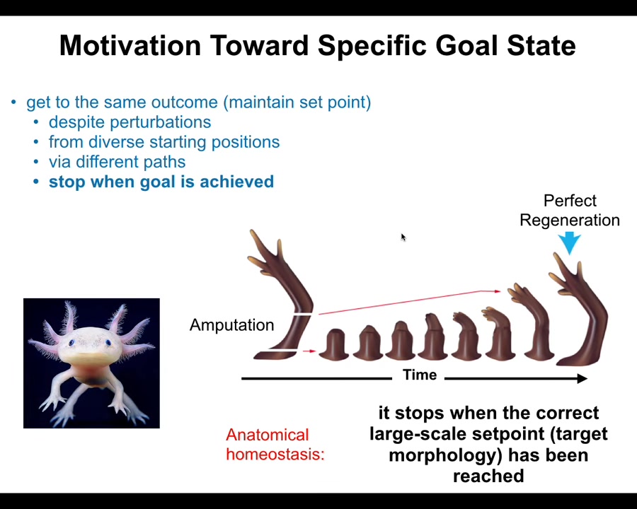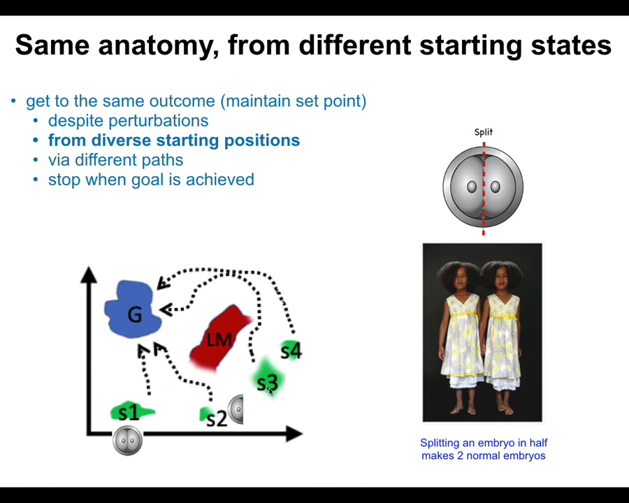 First of all, if you chop embryos into pieces, you don't get half bodies. You get normal monozygotic twins, triplets. These systems are able to get to the same ensemble of goal states, a correct human target morphology, from different starting positions. You can start as an embryo cut in half. You can start as a normal embryo. You can avoid local maxima and still get to where you're going. You can get to the right place from different starting positions.