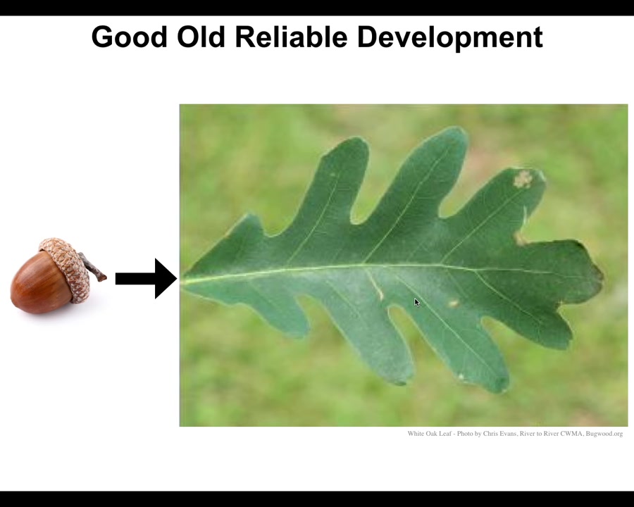 First, an evolutionary example in plants. You look at an acorn and it very reliably makes these oak leaves and you think that's what the genome knows how to do. This genome specifies; it encodes this particular shape. That's really not a good way to think about it at all.