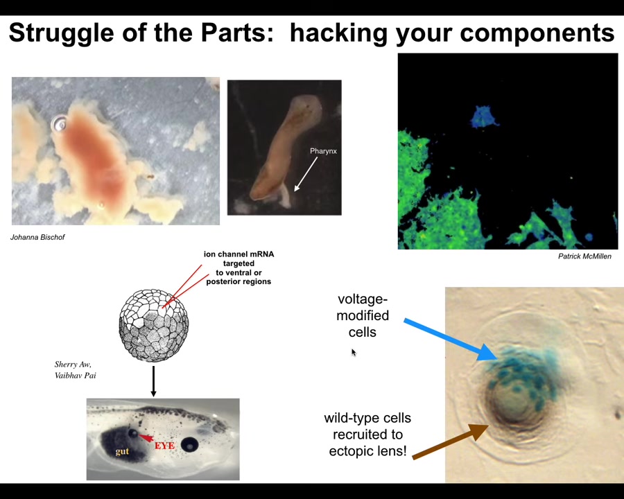 And here's an example of that from our regenerative medicine program where we take an early frog embryo and we provide a bioelectric signal to a group of cells that tells them to become an eye. If we do this in cells that are going to be gut cells, they build this eye. So we want to be as convincing as possible so that we can build new organs for regeneration, for transplantation. And you can see here, this is a cross-section of this early region. The blue cells are the ones that we injected. So we want them to acquire a new goal to form an eye. We want them to convince their neighbors because there's not enough of them to make an eye. All these other cells that are not blue, we didn't touch those. These, the blue cells, convince them to make an eye, right? So there's a second level of instruction here. These other cells resist because it's a cancer suppression mechanism. If somebody's telling you to become a weird voltage, you try to resist and, in fact, normalize them out. And so they resist and there's this battle of worldviews that happens where these cells are saying, we're going to build an eye and these are saying, no, you should be gut cells. And depending on who wins, you either get an organ or you don't. And this is the kind of hacking that we want to control. Again, none of this is manipulating DNA. None of this is even seeking to manipulate specific gene expression. It's about convincing a complex system to undertake a new goal.