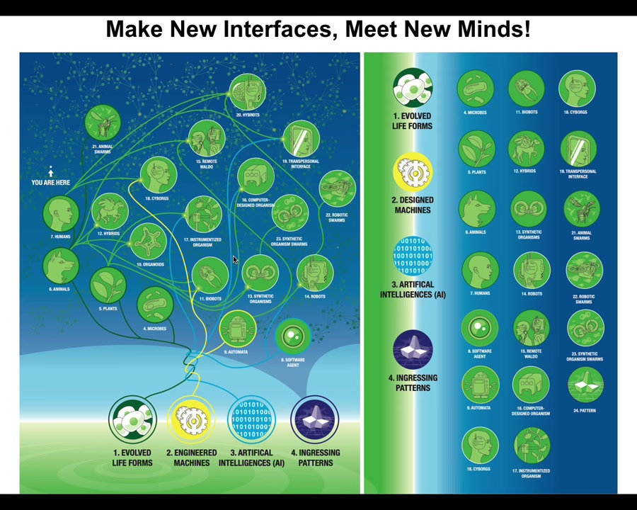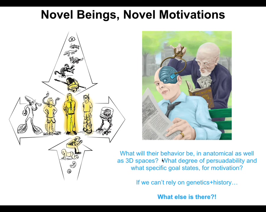 That means that when you make new interfaces—new bodies that are different from the natural ones—any combination of evolved material, engineered material, and software is going to be a home for these ingressing patterns. When you make these novel kinds of embodiments, you're going to meet some new patterns you've never met before. Now we can talk about AIs and cyborgs and hybrots and all these kinds of things.