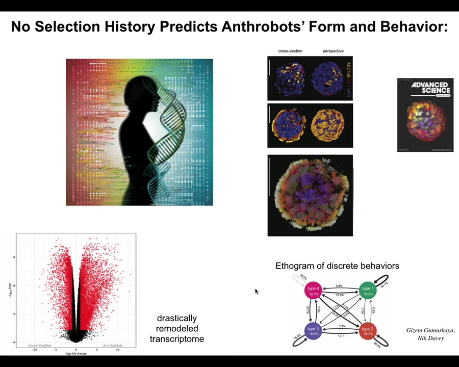 In fact, the Xenobots have 9,000 differentially expressed genes, so about half the genome. Their transcriptome is completely different. In transcriptional space, they have gone to a completely different location than they would have as human airway tissue. Again, their genome is standard. We haven't touched the genome; it's completely the same. You would have no idea from sequencing them that you're not looking at human airway, or in fact, human cells at all. They have four different types of motile behavior. We can draw a little behavioral diagram that shows us the transition probabilities between their different behaviors. Why are there four? Why are there not ten or one or zero? There's never been any anthrobots. There's never been selection to be a good anthrobot. Where do these things come from?