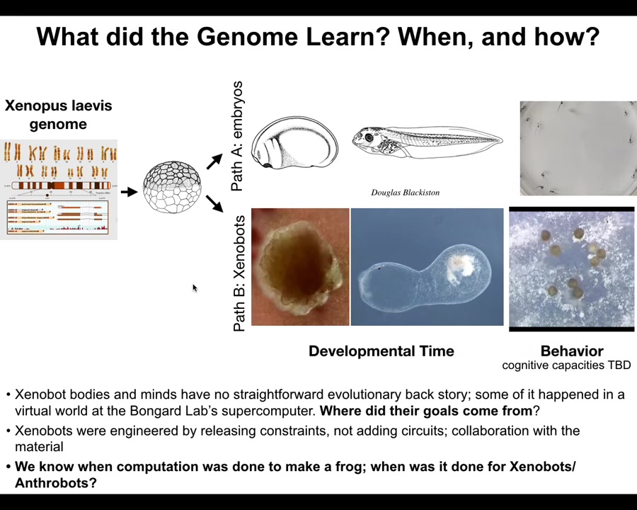 We know when the computational cost was paid to design this, it was paid during the eons that the frog genome was bashing against the environment, that's the standard story. And that makes sense. When did we pay the computational cost for this? There's never been any selection to be a good Xenobot. These kinds of novel behaviors.
