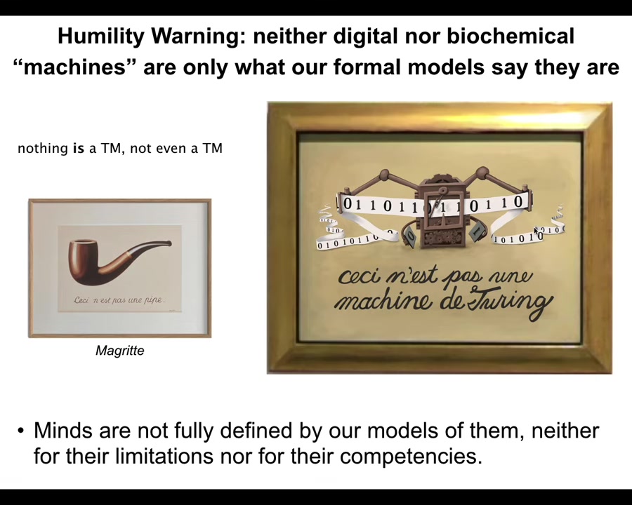 The formal models have limitations, and we should be very careful not to confuse those limitations with the limitations of the thing itself. When Magritte was telling us "this is not a pipe," this is a representation of a pipe. So we can say, this is not a Turing machine. This is a representation of a machine that has a particular set of capabilities and limitations. But that doesn't mean it's a full description of what's happening.