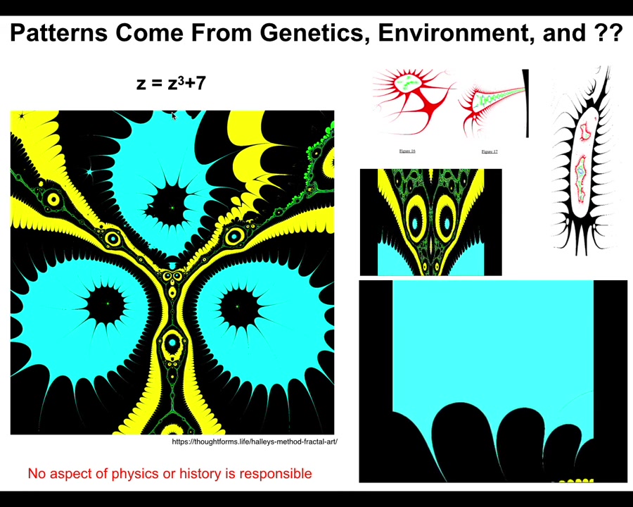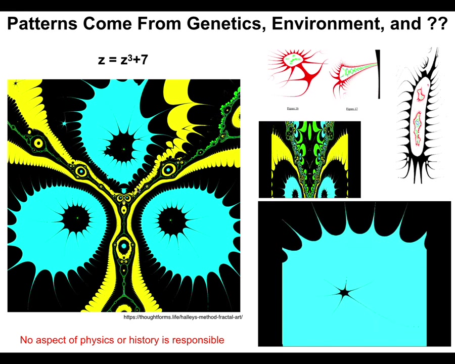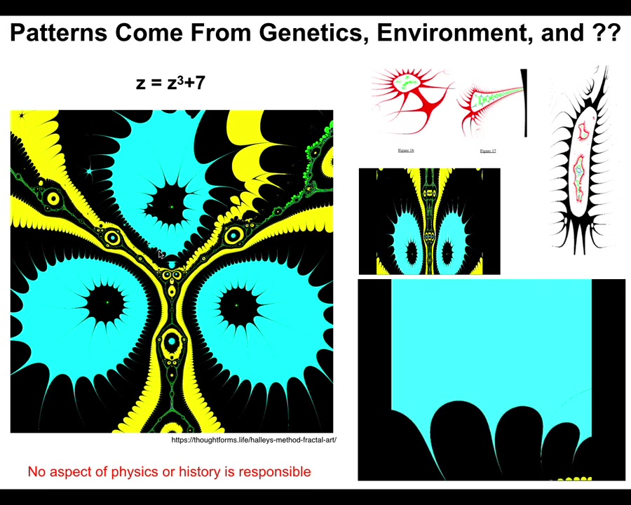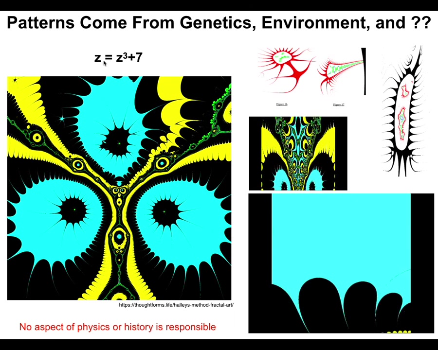 They come from this tiny little seed. It's not compression. There's no way you're going to compress something this complex into a thing of six or seven characters. This is an index into a pre-existing pattern. It's a mathematical object. And the important thing about these mathematical objects is if you ask why does it have the shape it has, the answer is not because there was a process of selection that killed off all the things that didn't look like this.