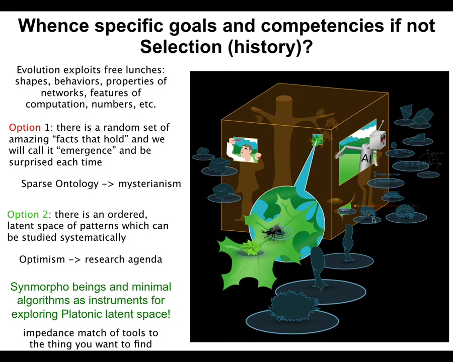 Towards the end, I'm going to argue that in order to understand where these motivations come from, and more importantly, to be able to predict and to call up the ones you want in your artificial systems, we have to start thinking about what you might call a Platonic space. It's a structured space of patterns, of form and behaviors that is really critical for both biology and physics. I'm going to argue briefly that basically standard reductive physicalism is quite insufficient for either causation or explanation in these systems, and more importantly, for building, for creating new things. I'm going to argue at the end, too, that even extremely simple interfaces are the benefits of some of these ingressing patterns from this latent space.