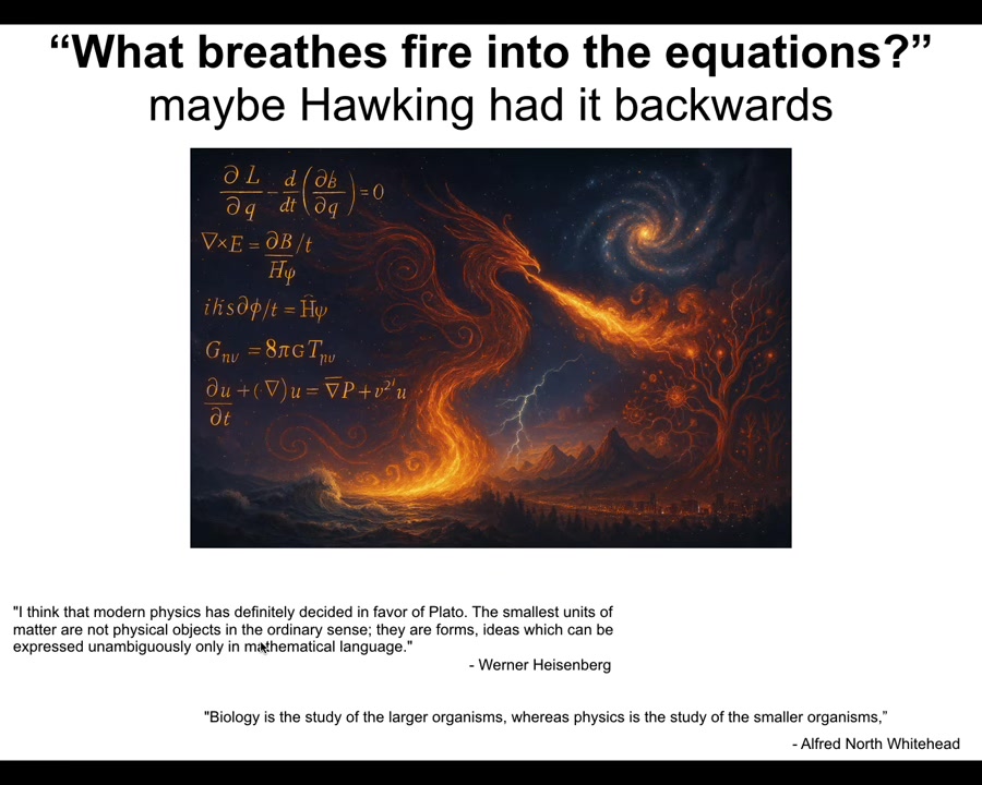 I suspect that Hawking asked what breathes fire into the equations. Maybe that was backwards. Maybe it's actually the equations describe certain structures of that space. And that's what breathes fire into the facts of biology and certain facts of physics and so on. I'm not the first person to say this. Heisenberg and Whitehead basically pointed this out too.