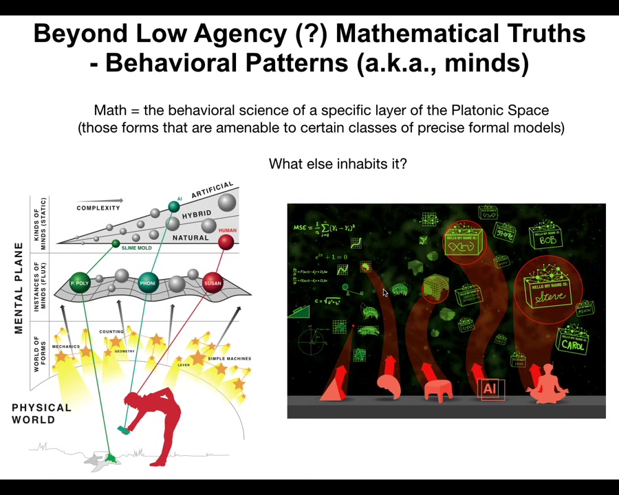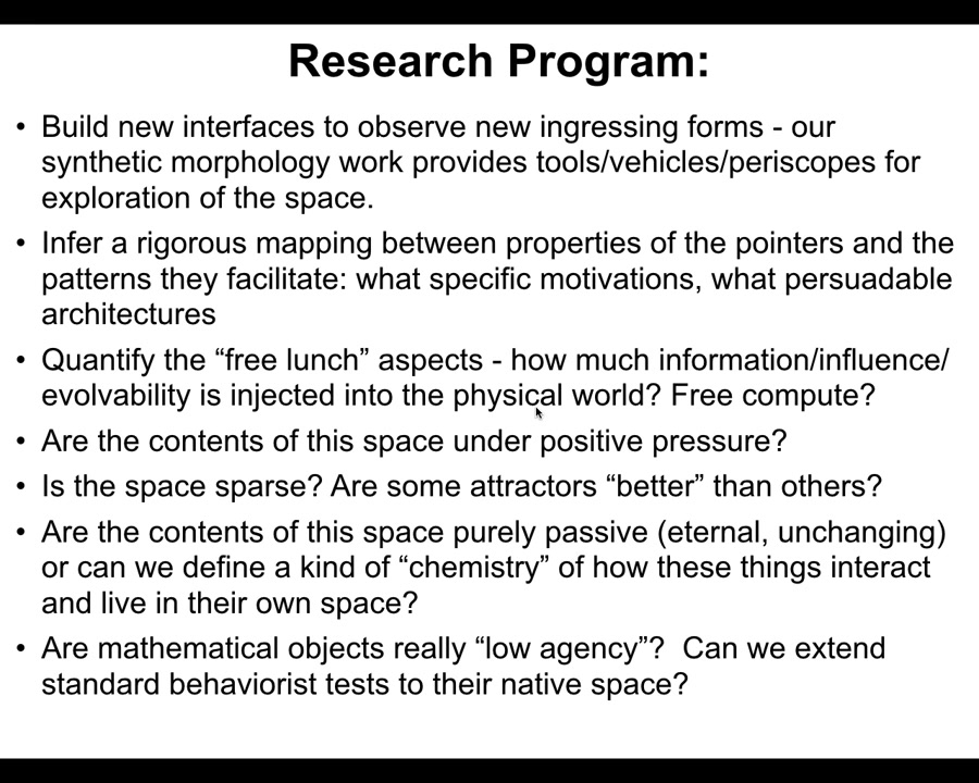 Here are some hypotheses and speculations: I think that everything from machines, cells, embryos, swarms, robots, whatever, are pointers into this space. They're interfaces through which these patterns ingress into the physical world. Physics is what we call systems that are constrained by these patterns, but biology is what we call when systems exploit these patterns and use them as a kind of free lunch to advance. All engineering is partly reverse engineering, and the attitude towards your constructions and towards AI and everything else should be less Skinner and more Piaget. You want to not just have reward functions. You want to understand what are the intrinsic motivations of the system and to what extent we can collaborate, cooperate with it, because you're going to get surprises, not just perverse instantiation, not just complexity and unpredictability. You're going to get the emergence of cognitive properties.