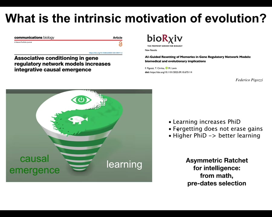 One of the recent things we learned is that there's this amazing feedback spiral where in very simple chemical networks they can learn. That's the first thing: they can learn. Learning increases their causal emergence. It makes the system more real, more than the sum of its parts. Forgetting does not erase those gains. Once you have those gains, you get better at learning. So it becomes a ratchet. It becomes a feedback cycle that points upwards towards intelligence. It's a free gift from the mathematics of networks and causal emergence. You don't need selection for this. It predates selection. So maybe these kinds of things, even processes like evolution, have a fundamental arrow towards higher intelligence; they're patterns of mathematics that underlie this. And then evolution, of course, will optimize the heck out of it. But in the meantime, it comes from math.