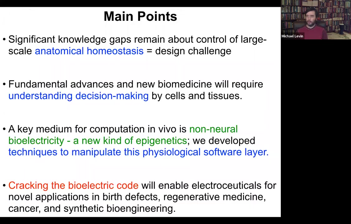 There are four basic points that I would like to get across today. The first is that there are really some very significant knowledge gaps about the control of large-scale anatomical homeostasis. It encompasses our understanding of the relationship between the genome and the anatomy. I'll show you why things are quite puzzling there. I will claim that fundamental advances in new biomedicine are going to require not only understanding the molecular mechanisms for this process, but also the decision-making by cellular collectives that is sufficient for it to happen. That a key medium for computation in living tissue is non-neural bioelectricity. We've developed some techniques to manipulate this layer of physiological software, and I'll show you why I say that. Fundamentally, looking towards the future, I will argue that cracking this bioelectric code will enable a novel approach using electroceuticals for applications in birth defects, regenerative medicine, cancer, and synthetic bioengineering.
