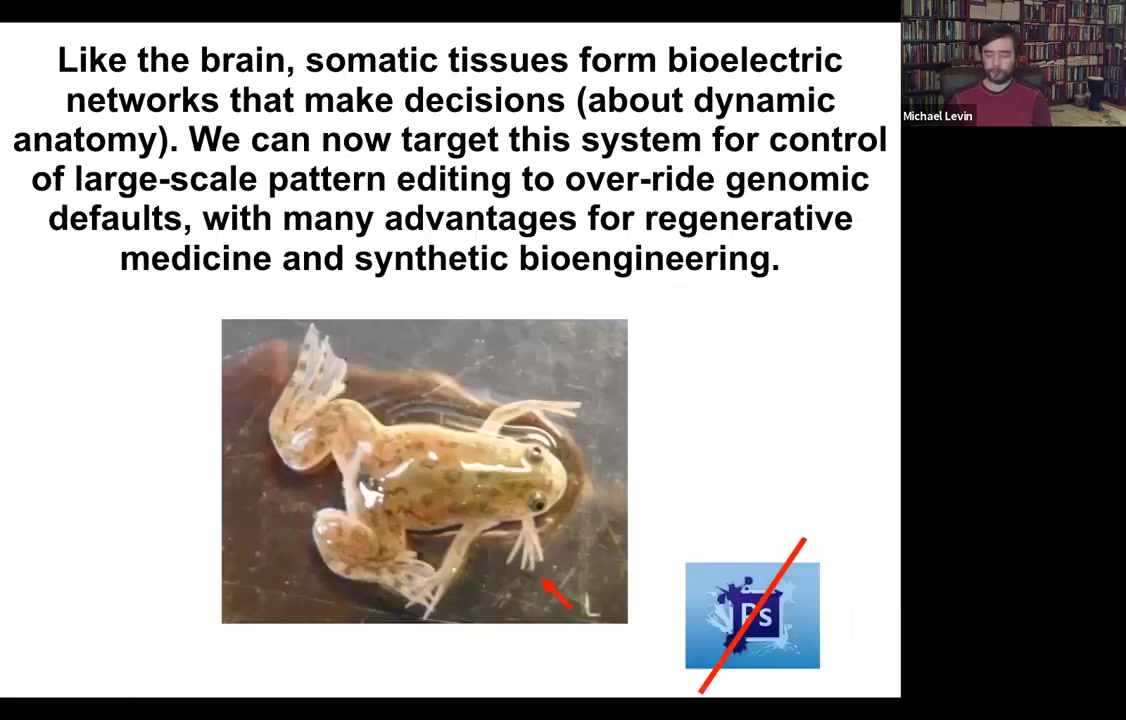 Boiling down the whole talk into two sentences, what I'm going to tell you is that your body tissues form electrical networks that make decisions. These are decisions about dynamic anatomy, and we now have the ability to target the system to control large-scale editing that can even override genomic default states with advantages and opportunities for regenerative medicine and synthetic bioengineering. I show you one of our five-legged frogs to point out that you're going to see weird creatures today. None of this is Photoshop. These are all actual living things that represent our attempt to test some of the models we have.