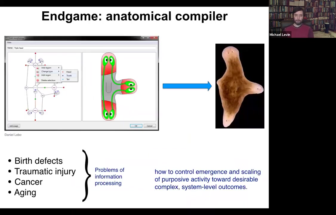 Here's this three-headed flatworm. Now, the reason that this is fundamentally important is that almost all of the problems of biomedicine — except for infectious disease, pretty much everything else: birth defects, traumatic injury, cancer, aging — would be solved if we had the ability to tell cells what to build. We would need the knowledge to control what cellular collectives cooperate towards building.