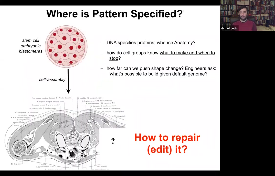 Everything is exactly the right stuff. It's absolutely a staggering amount of order. We would like to know, where is this information coming from? We're tempted to say DNA, but of course we know what genomes specify. The DNA specifies proteins. There's nothing directly in there that specifies any of this. We would like to know how cells use the genomically specified hardware that they have to know what to make and when to stop. In regenerative medicine, if a piece of this is missing, how do we get the cells to rebuild it?