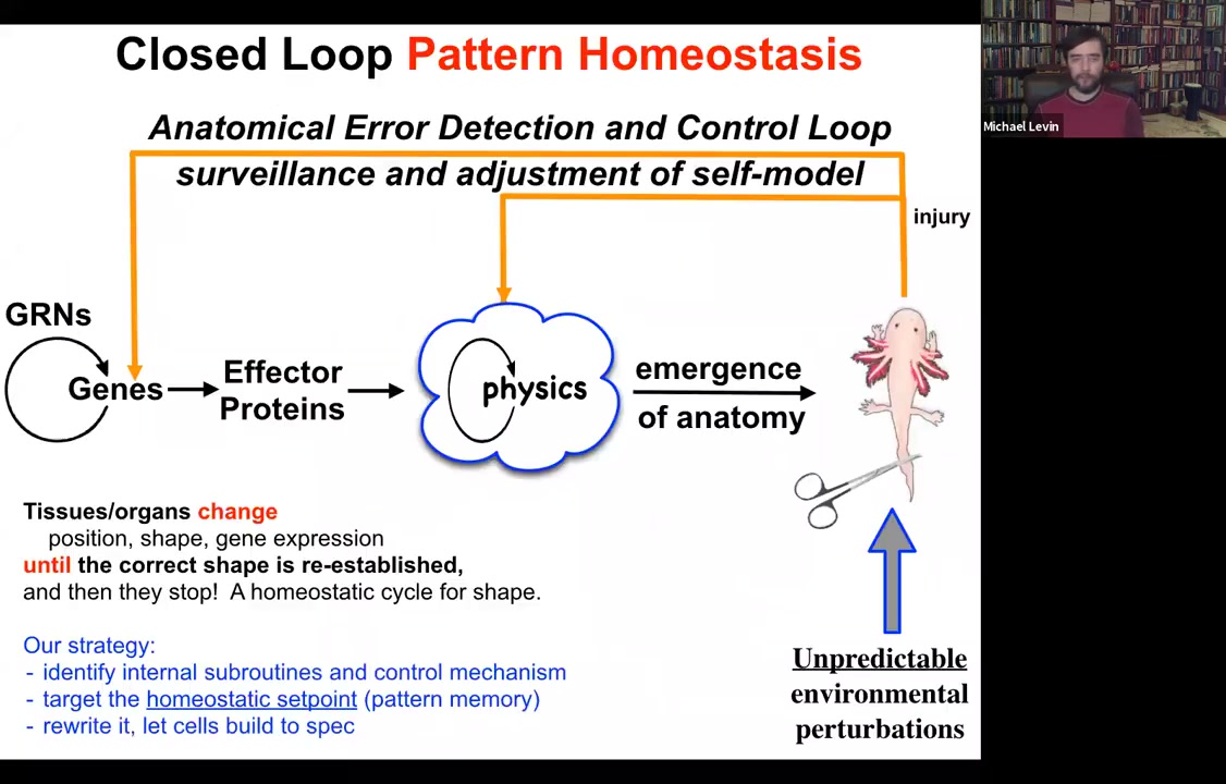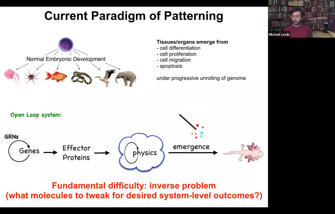 In standard developmental biology, the story that we're told is a kind of feed-forward open-loop system, which is very much based around emergence. The idea is that there are gene regulatory networks, so genes turn each other on and off. Some of these genes are effector genes; they code for effector proteins, so they are sticky or they diffuse or they exert force or something like this. Then there's this physical process where all of these things interact with each other. Then through things that are studied by the science of complexity, out come these amazingly complex results. Like the salamander here.