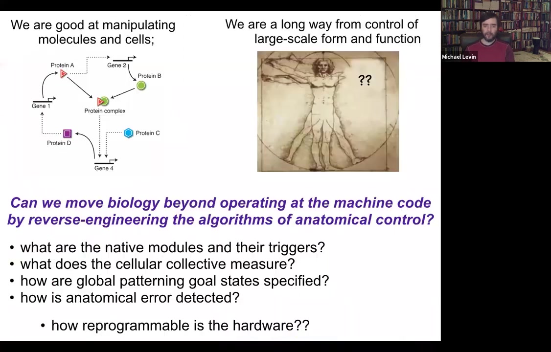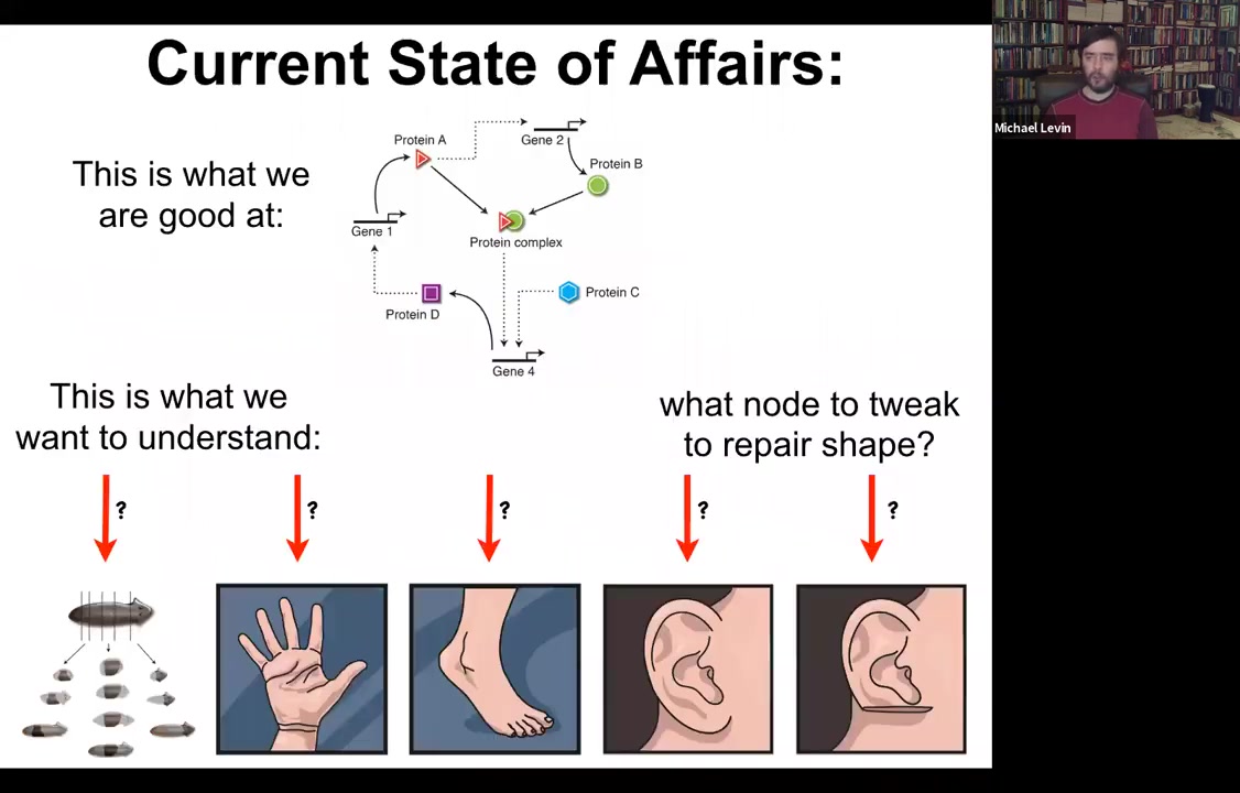 The current state of affairs is this. We're very good at figuring out the lowest hardware level of which genes and proteins interact with which other genes and proteins. But what we'd really like to understand are things like this: the ability of planaria to regenerate from pieces, the shape of the hand and the shape of the foot and why they're different, and what you would have to do to get these specific shapes back. It's not obvious what you would do at this level.
