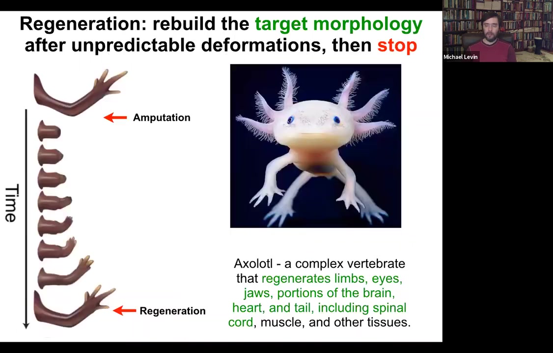 So the amazing thing is that... Some animals are very good at this, and their bodies show remarkable plasticity in this kind of collective activity of the cells. So for example, here, this animal is a salamander. It regenerates its limbs, its eyes, its jaws, its portions of the brain and the heart. So if they're amputated, they will grow back. And What's cool is that not only is this process incredibly flexible, meaning if you amputate at the shoulder, you grow the whole thing. If you amputate at the wrist, you start here and you just grow the parts you need, but then it stops. And that's the most remarkable part of all of this. And so lots of people work on trying to kickstart regeneration. But actually, how does it know when to stop? Because when it stops is when it has built a correct salamander arm. That's when it stops. How does the system know when it's built a correct salamander arm?