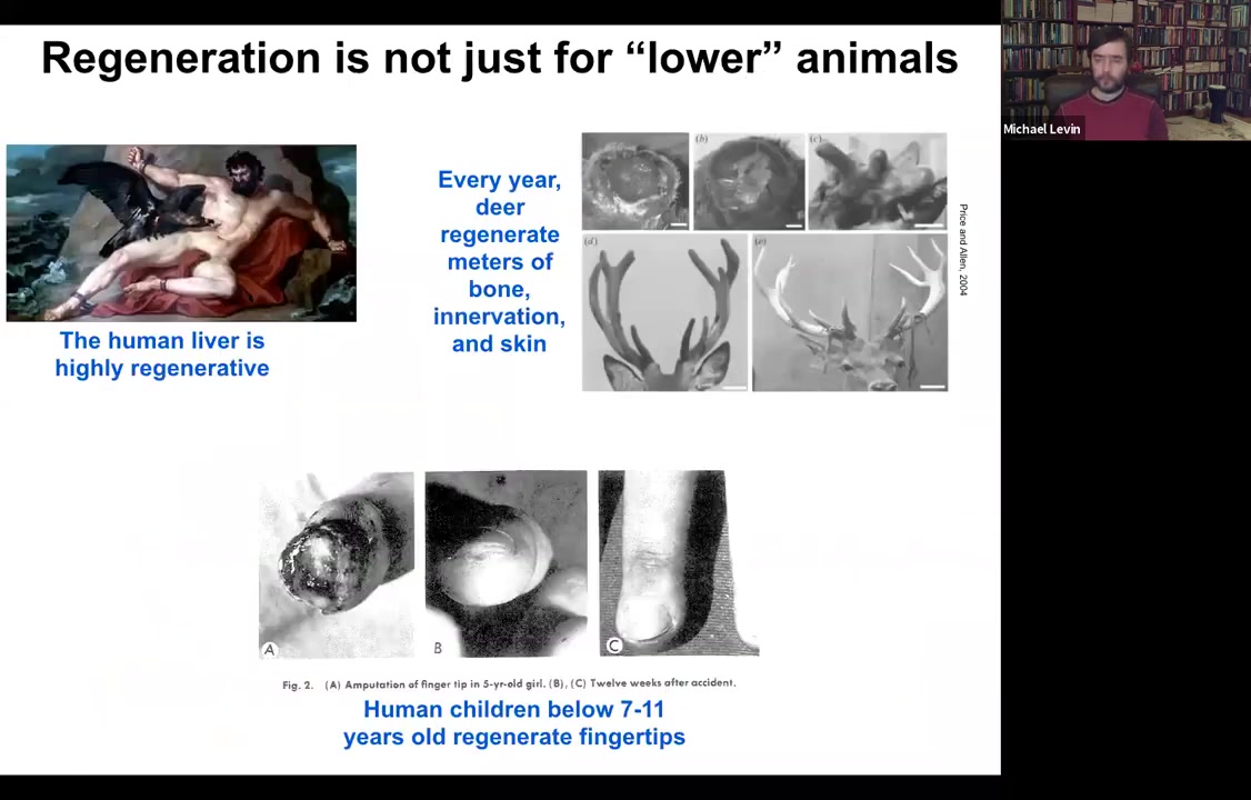 It's important to note that this is not just some weird quirk of salamanders. Humans and other mammals can do some of this. The human liver is highly regenerative. That's been known for a long time. Unclear to me how the ancient Greeks knew that, but they clearly did. Deer regenerate huge amounts of bone, up to a centimeter and a half of new bone per day. Bone, vasculature, innervation, and skin can regenerate. Even human children can regrow fingertips. It usually stops at a particular age, but if you keep it clean, the amputation will give rise to a cosmetically perfect finger.