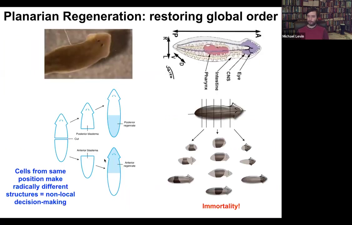 While the new stuff is growing, the remaining tissue is shrinking so that they will all, as quickly as possible, get to proportion, to correct proportionality. And the other thing about them is they're immortal. There's no such thing as an old planarian. So if you're interested in aging or these ideas that things inevitably wind down and accumulate errors and so on, planaria are telling us that is not absolutely required. Here's a life form that's basically immortal.