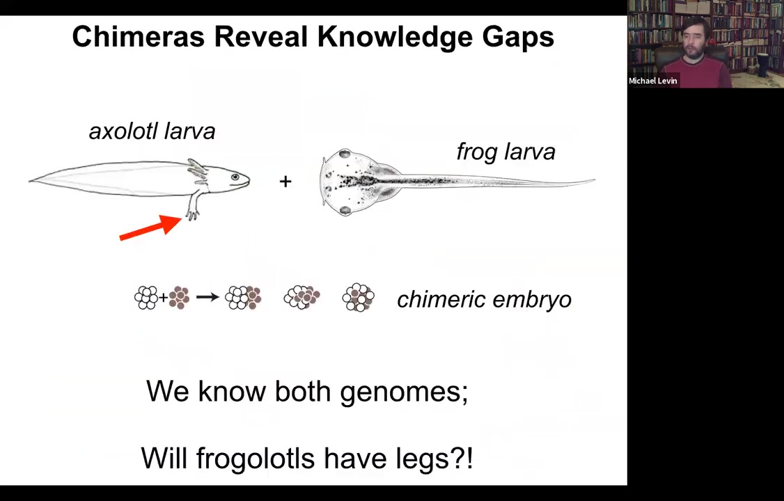 One can ask a simple question. If I combine early axolotl tissue with early frog tissue in early embryogenesis, I make a chimeric embryo. They're perfectly healthy. We call them frogolotls. We have the genomes, we have the axolotl genome, we have the frog genome. Now we ask a simple question: do frogolotls have legs? Even though we have all this information, we have no idea how to predict in advance whether frogolotls will have legs. If so, will they be made entirely of axolotl cells or of both types of cells? These are the kinds of things that we would like to understand.
