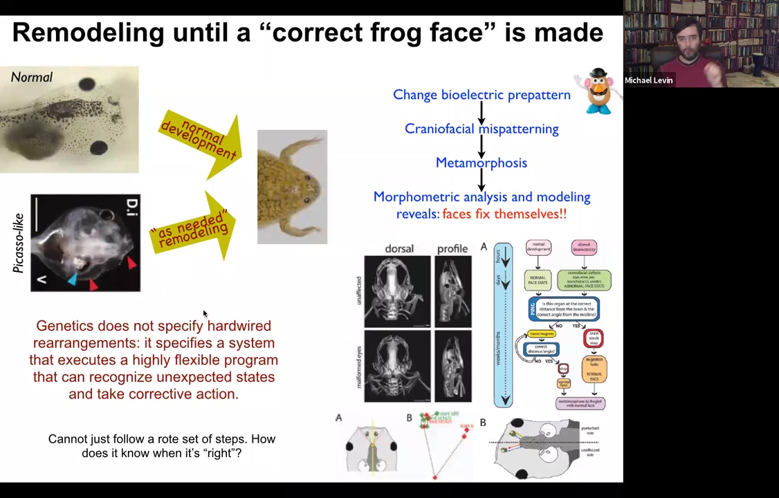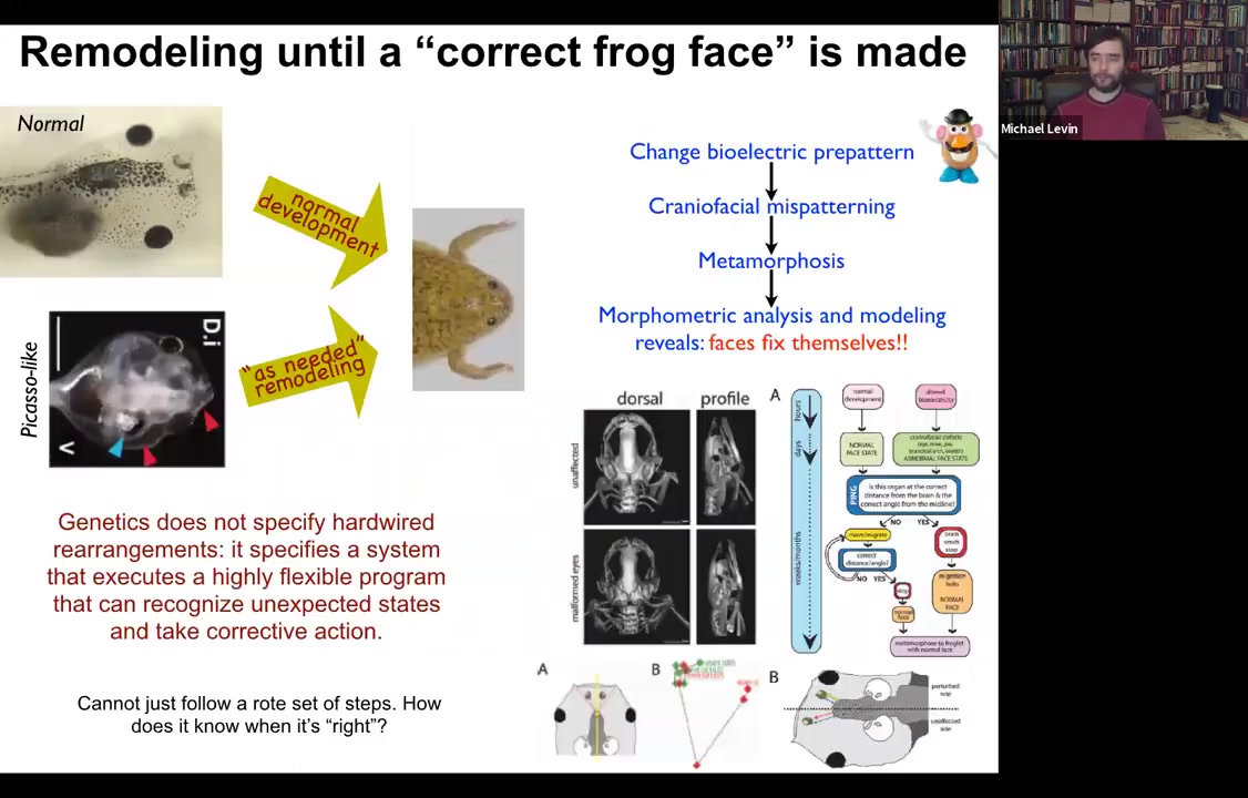 But everything moves around until it gets to a correct frog face and then the remodeling stops. So in fact, what the genetics specify is not a bunch of hardwired rearrangements, but a system that executes a really flexible error minimization scheme. It's able to start off at incorrect or abnormal positions and still get to where it needs to be. This parenthetically matches William James's definition of intelligence, which is the ability to reach the same outcome despite perturbations and starting from novel starting configurations. So how does this system know what a correct face is, and how do we get there?