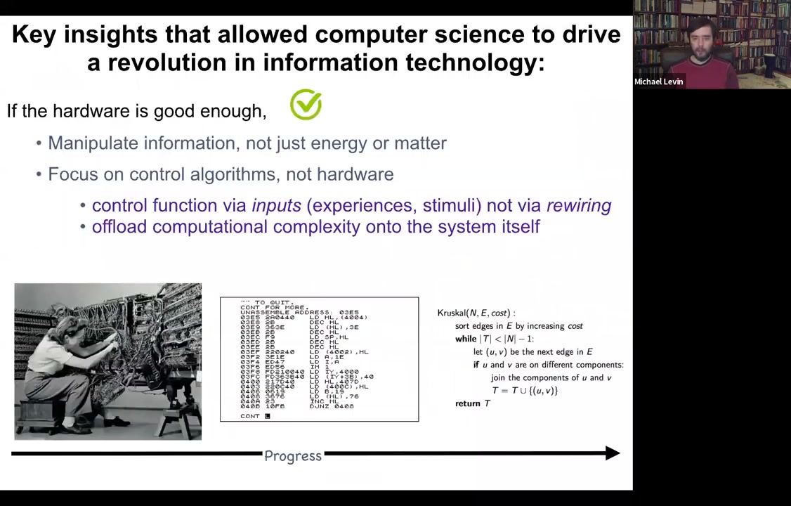 So in computer science, there was this really interesting journey that we took from, this is what programming looked like in the 1940s and 50s. In order to get the computer to do something different, you physically had to rewire it. You had to rearrange the hardware. You had to move the wires. But what computer scientists realized is that if your hardware is good enough, and I'm going to argue that biological hardware is definitely good enough, what you can do is something really interesting. You can reprogram the machine without touching the hardware, by giving it stimuli or experiences, inputs. And that will allow you to program in a much higher level language where you're not drowned in the details of the hardware or even the machine language, but you're actually able to take advantage of some really high level types of programming strategies to get very complex kinds of outcomes. And I'm certainly not arguing that living things are computers in the sense that they're not built to the same architectures that our current computers are. But this idea of reprogrammable hardware and of controlling a system by inputs and stimuli as opposed to physical rewiring, it's very powerful.