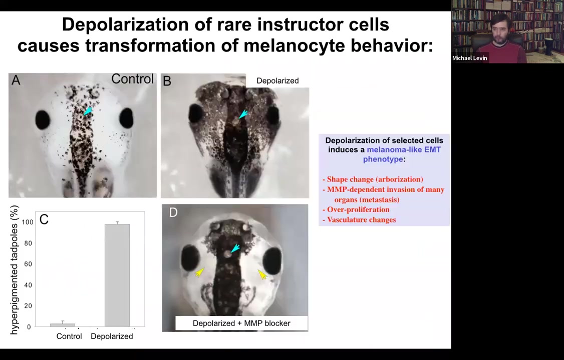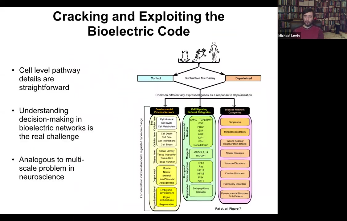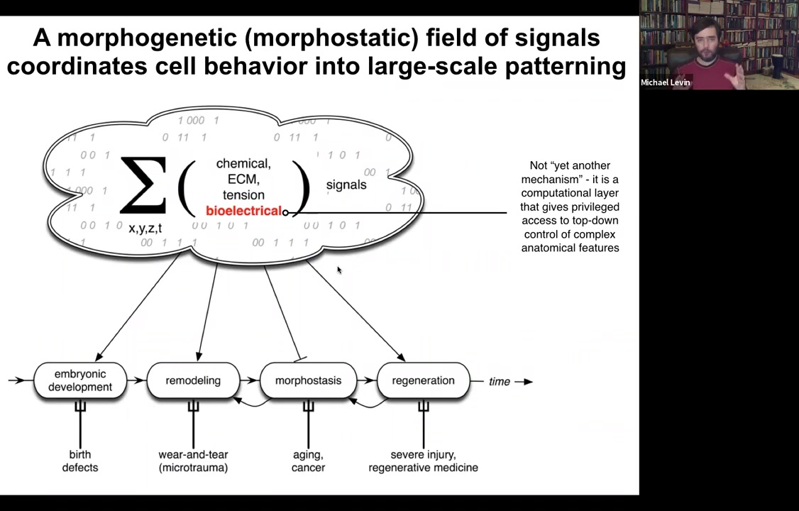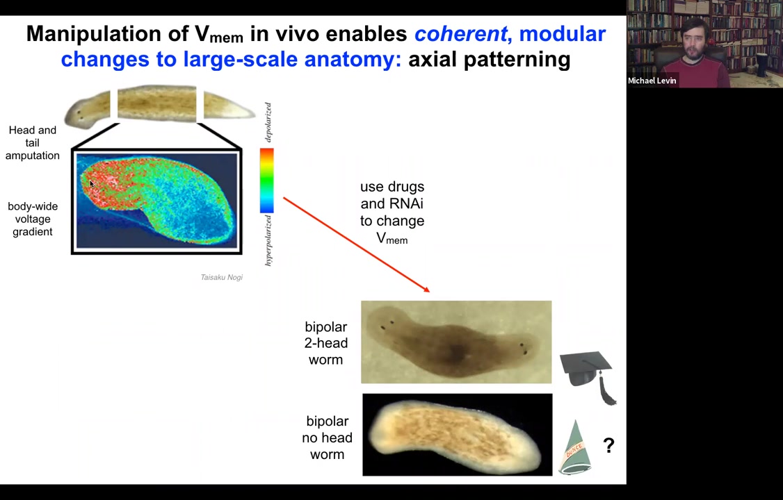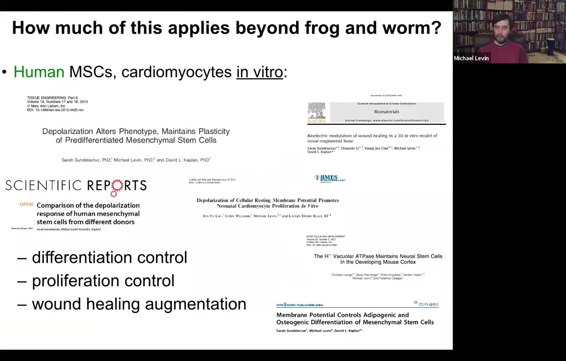 This is not just things that apply to frog and worm. We've done some work with David Kaplan and Lauren Black and others on human mesenchymal stem cells and cardiomyocytes. You can control the kinds of things that you can see in vitro, differentiation, proliferation, wound healing. But I think that's not what the bioelectricity is for. What the bioelectricity is really for in terms of why evolution uses it and why we should be interested in it is because it allows us to exploit the modular nature of the anatomical decision-making, because we can control very large-scale outcomes, not micromanage the details.