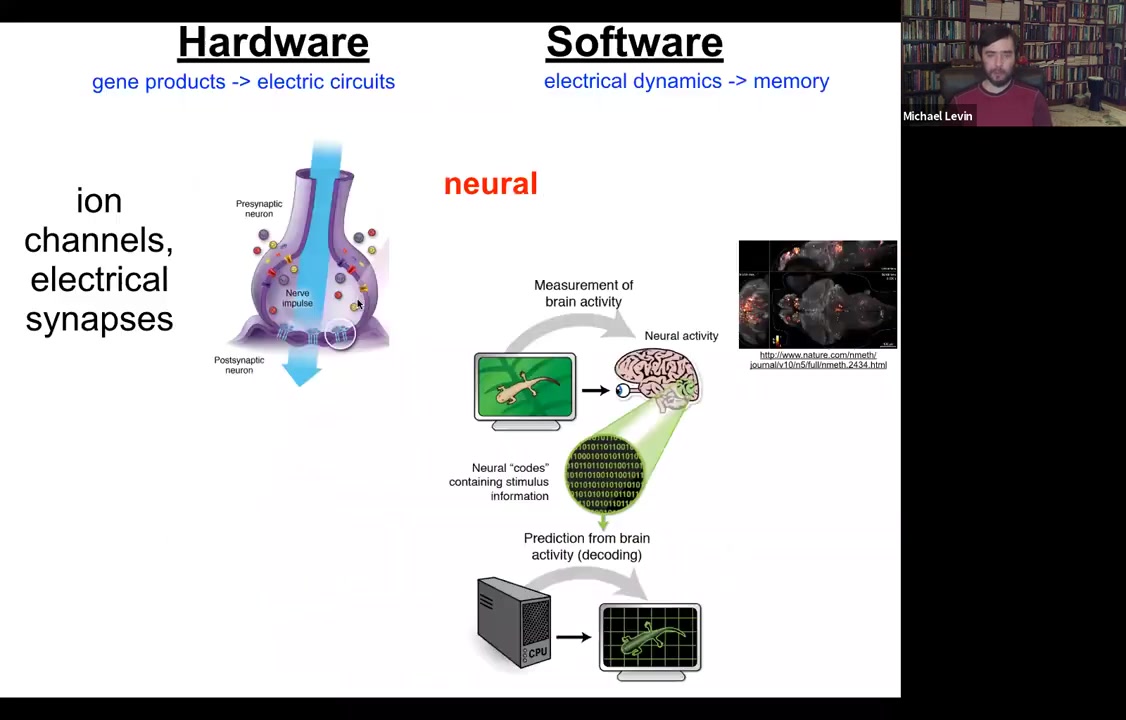 All cells do this. All cells have ion channels. Most cells have electrical synapses known as gap junctions to their neighbors. We have undertaken this project to try to do the same kind of decoding. Here's an embryo, and we would like to read all the electrical conversations that bind the individual cells into a collective that can undergo anatomical homeostasis towards large states, build a limb, build a kidney.